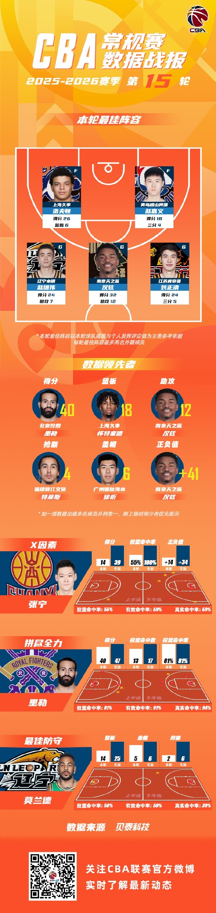 第15轮最佳防守球员由来自辽宁本钢的莫兰德获得。