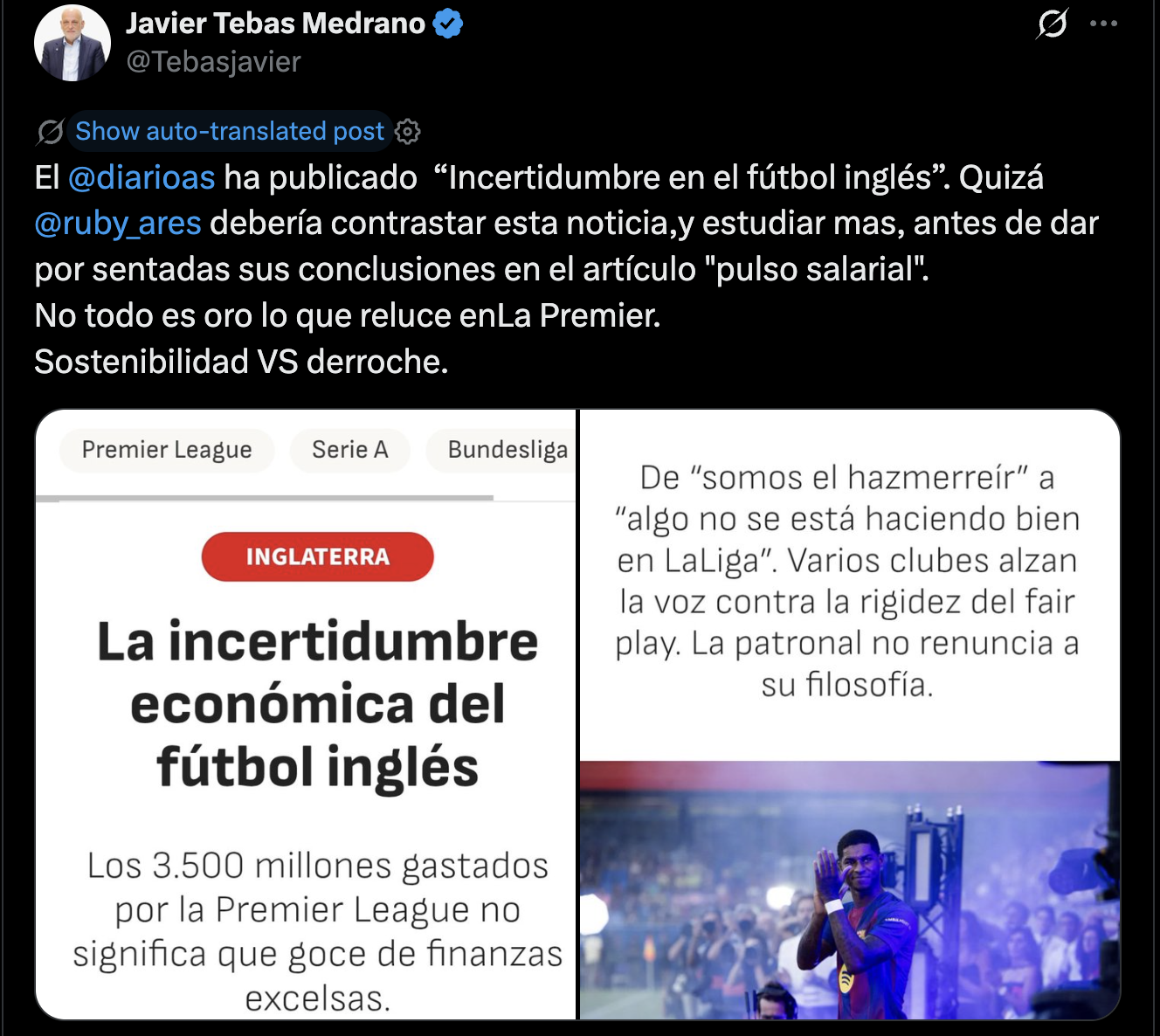 特瓦斯写道:“《阿斯报》发了篇叫《英格兰足球的不确定性》的新闻。我觉得ruby_ares(作者)在他那篇《薪资困境》里下定论之前,应该先看看这个新闻,多研究研究。毕竟,在英超,可不是所有闪光的东西都是金子。这是可持续性和浪费的区别。”
