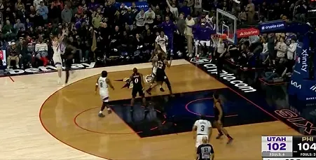 第四节比赛,菲利波夫斯基关键三分未能命中,还剩2秒爵士落后76人2分。