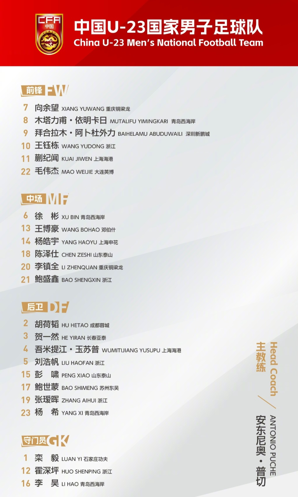 中国U23男足首发(5-3-2)